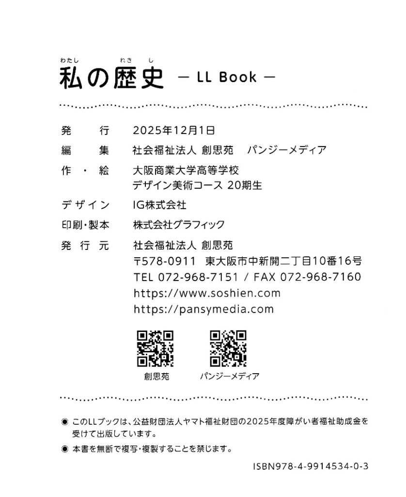 知的障害がある人たちが「どんなに障害が重くても地域で普通に暮らす」ことを支援するため、東大阪を拠点に活動を続けている「創思苑」の利用者の19人の「歴史」を、大阪商業大学高等学校デザイン美術コースの生徒さんたちが、ひとり4ページのLLブックにしました。作り手の生徒たちは、受け手の皆さんと知り合い、その人のことを思いながら、その人のために、わかりやすい言葉や文を工夫し、絵を描き、絵文字も自分たちでデザインして作っています。